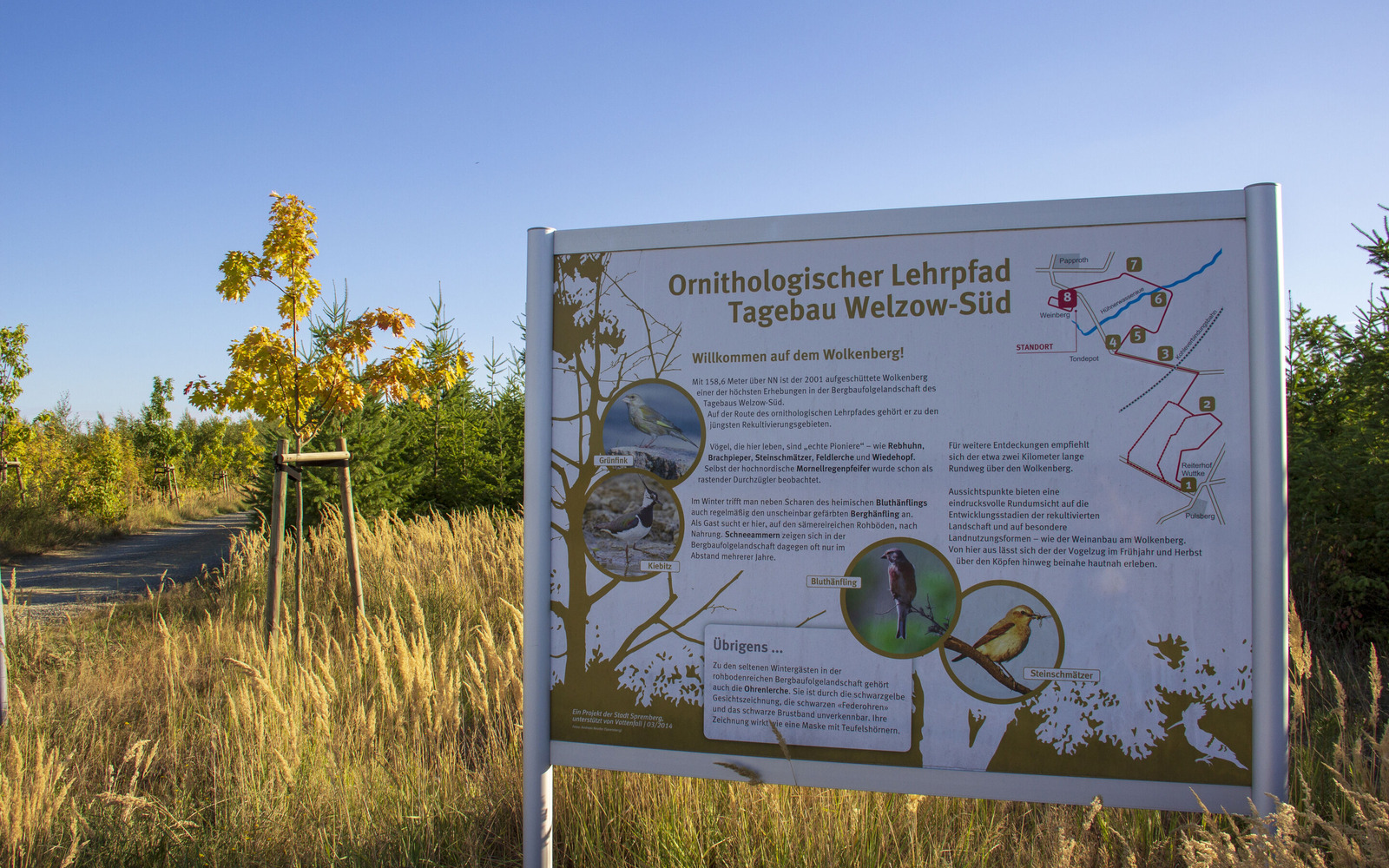 Vyhlídka Wolkenberg se nachází v již rekultivované oblasti na okraji dolu Welzow-Süd. V nejvyšším bodě kopce Wolkenberg se nachází posed. Odtud si lze vychutnat skvělý výhled na zvrásněnou krajinu a blízké vinice. Na jižním svahu Wolkenbergu totiž dozrává nové víno. Na místě, kde dříve stála stejnojmenná vesnice, bylo vysazeno 26 000 hlav vinné révy. Na úpatí Wolkenbergu stojí památník bývalé obce, která musela v roce 1991 ustoupit těžbě. Především v období tahu na přelomu dubna/května a sprna/září lze na místě pozorovat početná hejna ptáků. Často a po celý rok jsou tu k vidění káňata lesní, poštolky obecné a krkavci. V létě tu narazíte na luňáka červeného a hnědého, motáka pochopa a příležitostně také na orla mořského či motáka lužního, v zimě tu pak potkáte zejména káně rousné a motáka pilicha. Kolem Wolkenbergu vede 2 kilometry dlouhá pěší stezka. Tip: Vyhlídka Wolkenberg je součástí ornitologické naučné stezky, která začíná v části města Spremberg zvané Pulsberg. Odtud vede různými stádii rekultivace krajiny a nabízí tak možnost spatřit ptačí druhy, které jsou typické pro oblasti, kde dříve probíhala těžba uhlí.