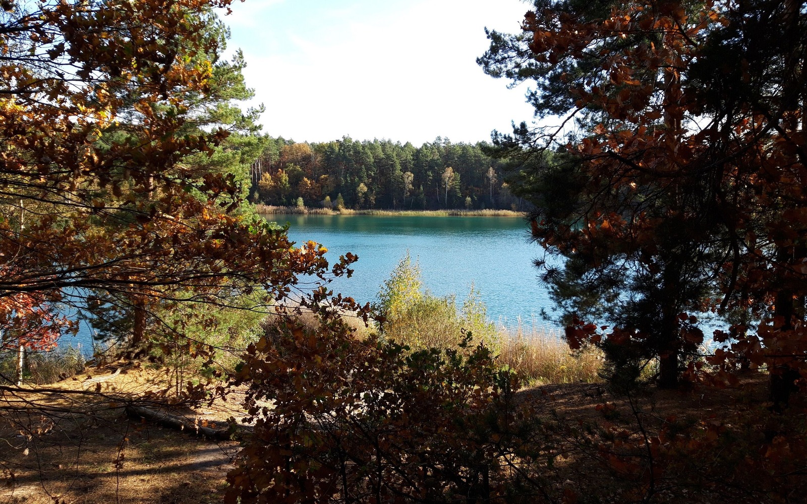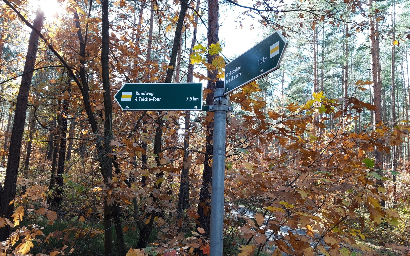 Direkt zu Beginn schlängelt sich der abenteuerliche kleine Waldweg an dem Großen Sandschacht vorbei. Dieser verzaubert mit seiner türkis-grünen Färbung. Folgt man der Ausschilderung weiterhin, wird der nächste Teich mit kleinem Rastplatz zum Verweilen erreicht. Mit neuer Energie kann die Tour schließlich fortgesetzt werden. Nach Verlassen des Waldweges folgt in einiger Entfernung der Blick auf den Petermannsteich. Auch eine Friesenpferdezucht gibt es hier auf der linken Seite zu sehen. Von nun an folgt man einer asphaltierten Straße wieder zurück zum Familienpark. Auf dem Rückweg folgt man dem Weg neben dem Anschlussgleis des Steinwerkes. Hier läuft man durch den Kiefernwald.