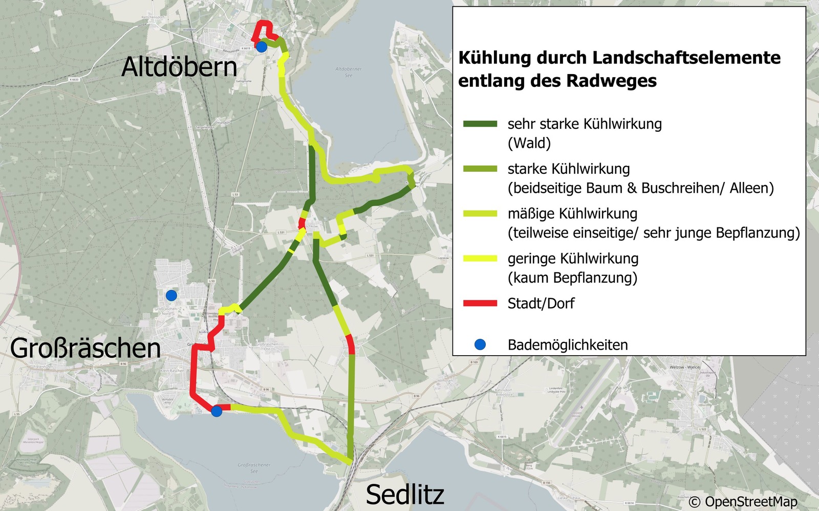 Wärmekarte des Radweges (rot = sehr warm, dunkelgrün = sehr kühl), Foto: OpenStreetMap, Lizenz: OpenStreetMap