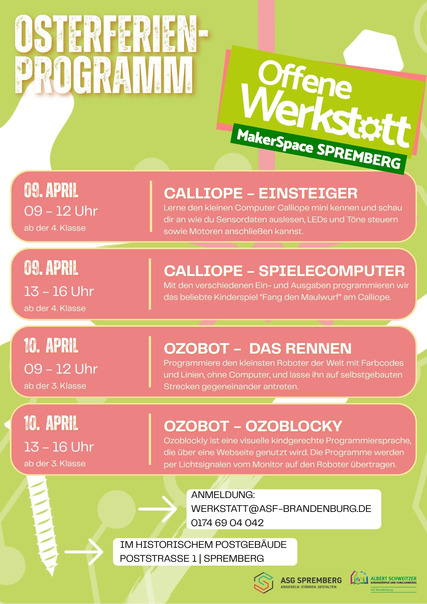 In der Offenen Werkstatt, MakerSpace Spremberg erwartet euch ein spannendes Ferienprogramm rund ums Programmieren und Tüfteln, perfekt für neugierige Kids! Mit den verschiedenen Ein- und Ausgaben pogramieren die Kinder das beliebte Kinderspiel "Fang den Maulwurf" am Calliope. Das Angebot richtet sich an Kinder ab der 4. Klasse. Wichtig, Anmeldung erforderlich!