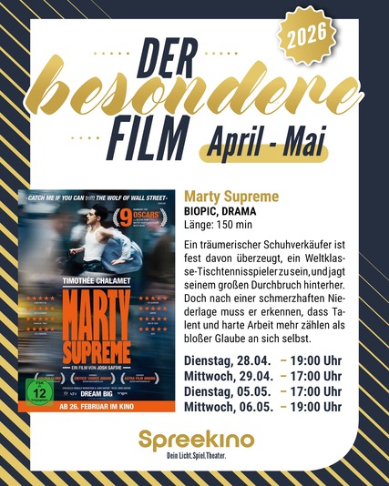 Mit _Marty Supreme_ erwartet das Publikum ein intensives Biopic-Drama über große Träume, harte Rückschläge und den unerschütterlichen Willen, es nach oben zu schaffen. Ein junger Schuhverkäufer jagt seinem Traum hinterher, ein Weltklasse-Tischtennisspieler zu werden, doch der Weg dorthin ist alles andere als einfach. Ein Film über Ehrgeiz, Realität und das, was wirklich zählt.