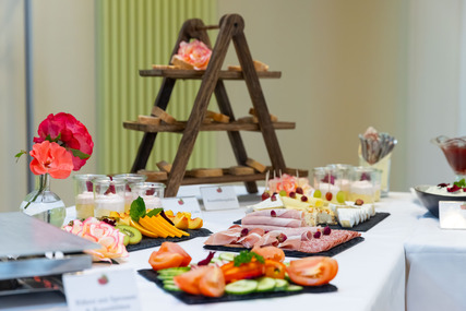 Die Gäste erwartet ein vielfältiges Frühstücksbuffet mit kalten und warmen Speisen, ergänzt durch eine Auswahl an frischem Kuchen. Filterkaffee sowie Wasser (still und sprudelnd) sind im Angebot enthalten.