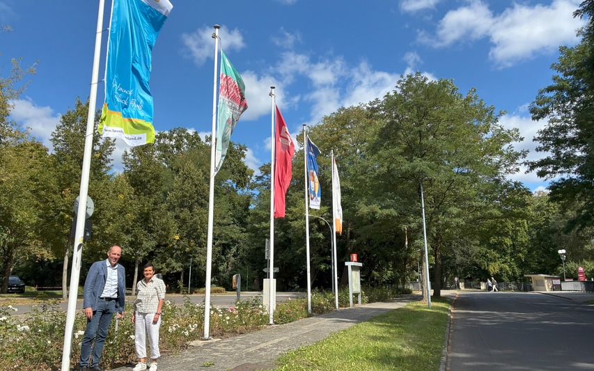 Bildunterschrift: Stefan Palm, Werkleiter Eigenbetrieb Kultur, Tourismus, Marketing Rosenstadt Forst (Lausitz) sowie Parkmanager und Kathrin Winkler, Geschäftsführerin des Tourismusverbandes Lausitzer Seenland e.V. nach dem Hissen der Lausitzer Seenland Fahne auf dem Parkplatz am Ostdeutschen Rosengarten in Forst (Lausitz) im Sommer