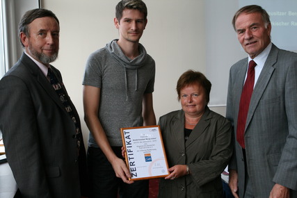 Übergabe der Zertifizierungsurkunde von Gunter Fritsch (r.), Landtagspräsident Brandenburg und Vorsitzender des Landestourismusverbandes Brandenburg und Dr. Wolfgang Richter (l.), ADFC-Bundesgeschäftsstelle an Sebastian Schmitt, Routeninspektor der Niederlausitzer Bergbautour und Mitarbeiter des Tourismusverbandes Lausitzer Seenland, und Michaela Birkner, Tourismusverantwortliche im Landkreis Spree-Neiße
