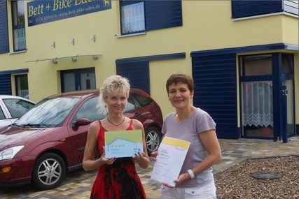 Bildunterschrift: Kathrin Winkler (r.), Geschäftsführerin des Tourismusverbandes Lausitzer Seenland e.V. übergibt die Klassifizierungsurkunden an Annett Wiener (l.), Vermieterin der Ferienwohnungen Bett + Bike Eden vor der Ferienunterkunft