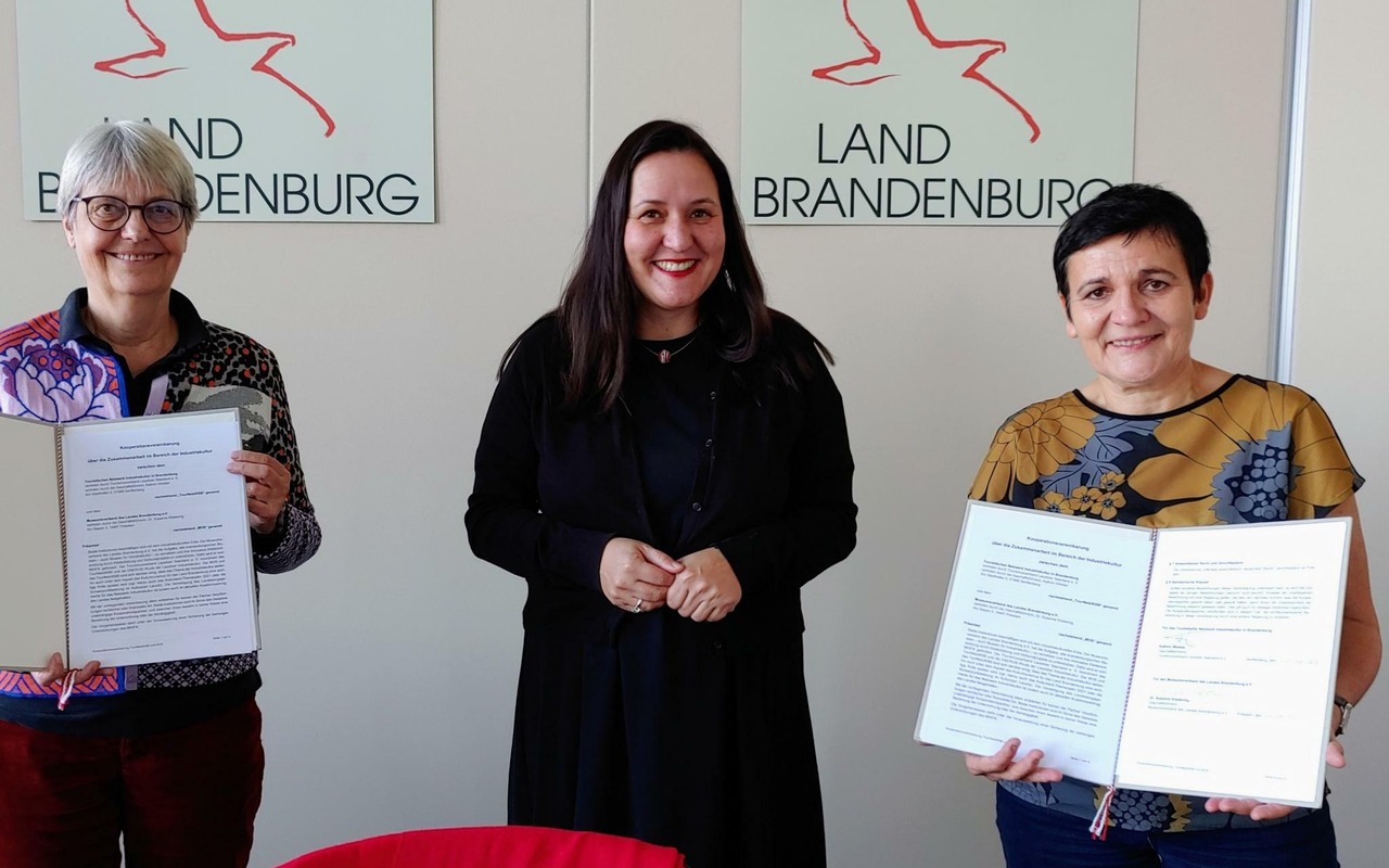 Dr. Susanne Köstering, Geschäftsführerin des Museumsverbandes des Landes Brandenburg e.V. (MVB), und Kathrin Winkler, Geschäftsführerin des Tourismusverbandes Lausitzer Seenland e.V. und des Touristischen Netzwerks Industriekultur Brandenburg (TourNetzIKBB) eine Kooperation zur Industriekultur präsentiert. Anschließend wurde die Kooperationsvereinbarung zwischen MVB und TourNetzIKBB unterzeichnet. Ziel der Vereinbarung ist es, bei der Produktentwicklung und der Vermarktung von touristischen Angeboten an Standorten der Industriekultur und Technikmuseen enger zusammenzuarbeiten.