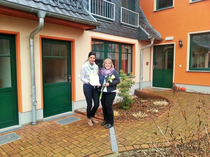 Bildunterschrift: Birgitt Jacob, Mitarbeiterin der Touristinformation Senftenberg übergibt die Klassifizierungsurkunden an Annett Leiker, Inhaberin des Ferienhofs Radlerslust.