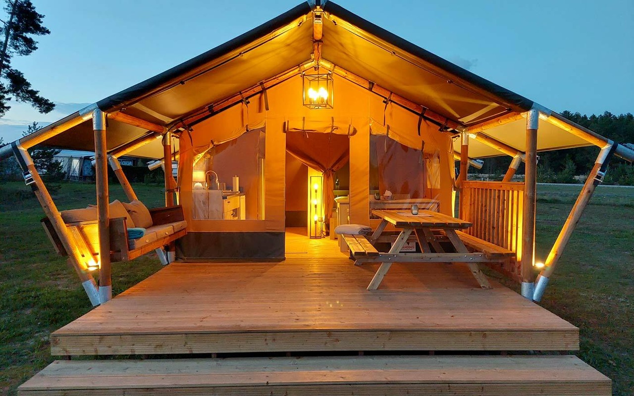 Die Vier-Personen-Zelte bieten Ferienwohnung-Standard mit gemütlichen Betten, einer vollausgestatten Küche sowie einem Esstisch mit Stühlen. Die Luxusvariante hat sogar ein eigenes Bad, während die Zwei-Personen-Zelte lediglich mit zwei Betten ausgestattet sind. Die leicht erhöhte und überdachte Terrasse bietet Traumblick auf den See. Perfekt für Streifzüge: Direkt am Campingplatz führt der 21 Kilometer lange autofreie Seerundweg vorbei. Zum Strand und zum Bootsverleih ist es ebenfalls nicht weit.