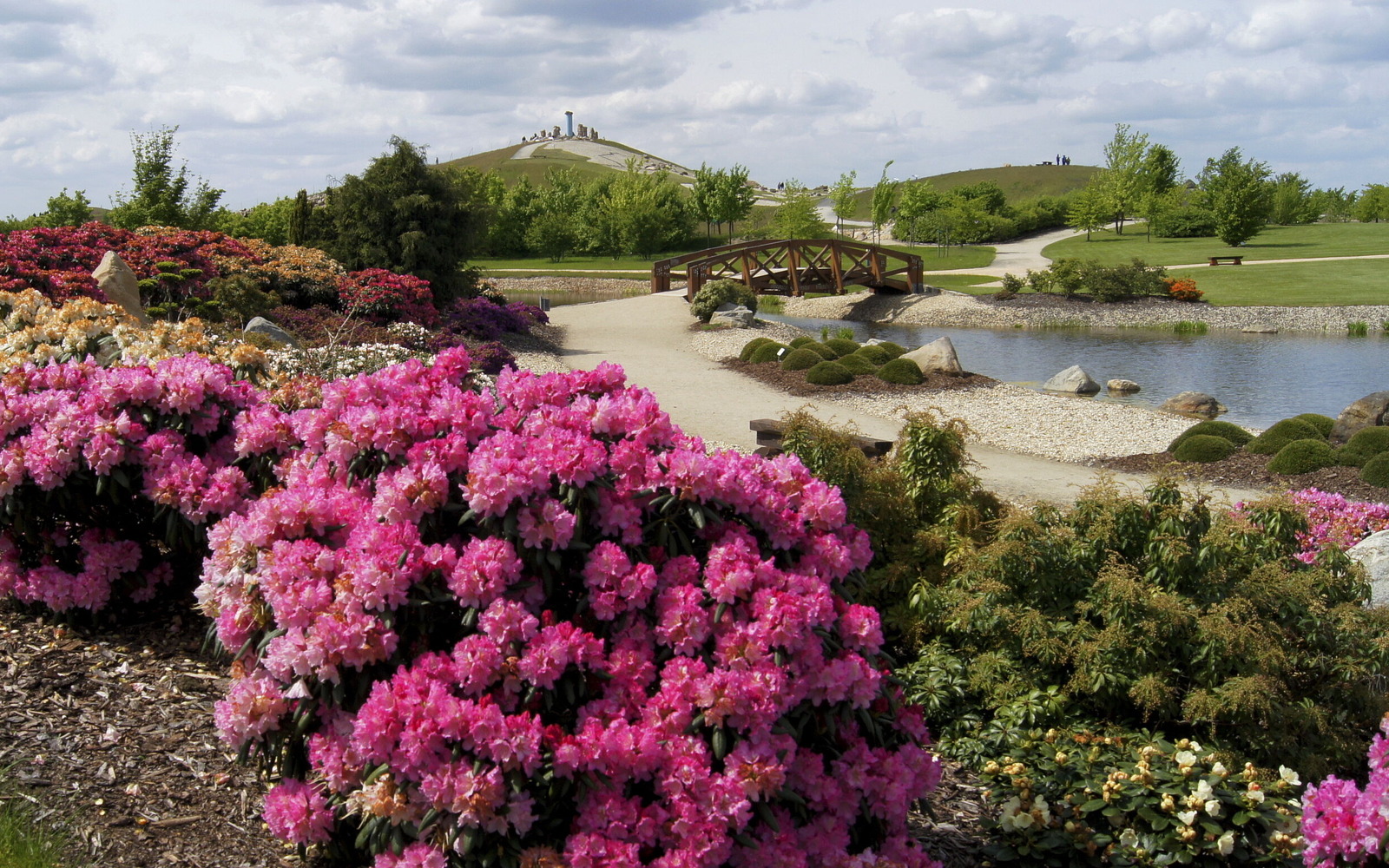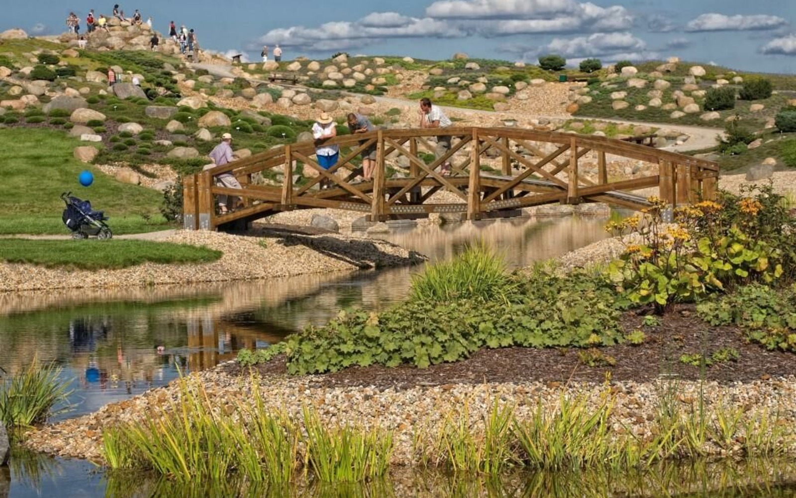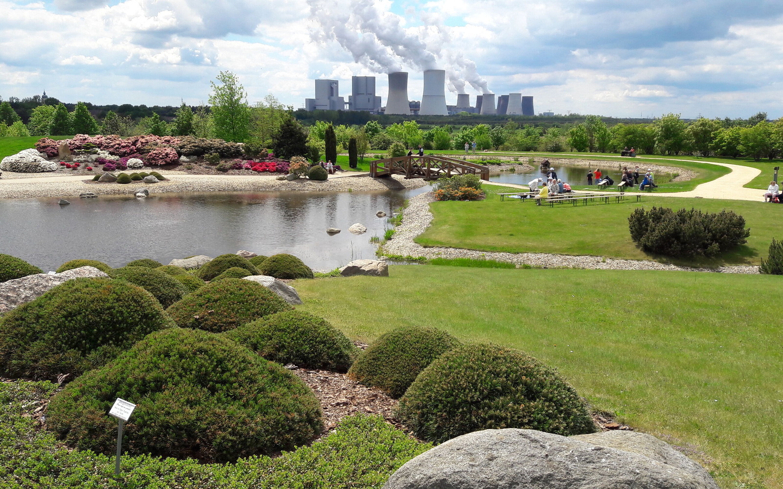 On the 20 hectare site, visitors can explore seven park areas: The stone garden, pond garden, heath garden, heath moor, forest lake, rock garden and Little Scandinavia. The "Feldzeichen" artwork stands proudly on the highest peak: From here, there is a fantastic view across the Lausitz region. Slightly hidden away in a valley cutting in the park, lies "Die Wüste" (The Desert), a carefully created adventure playground with boulders to climb on, the labyrinth in the Caravanserai and an aquatic playground around the bucket well.