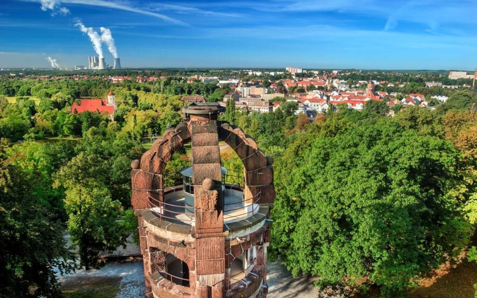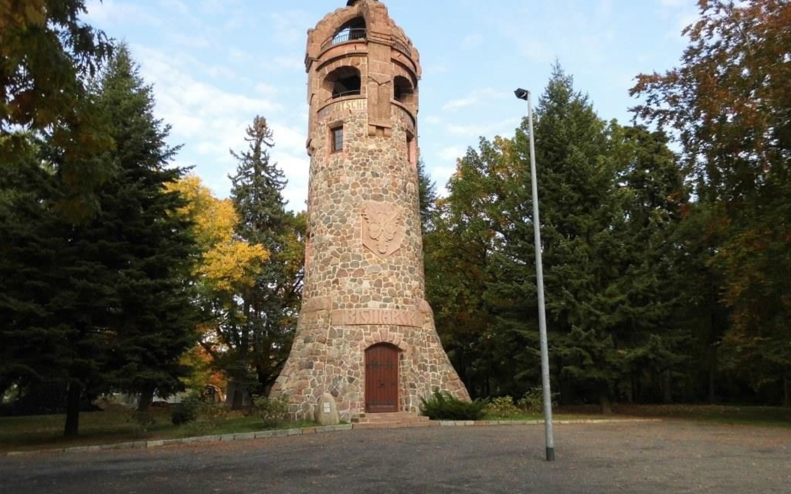 The Bismarck tower in Spremberg’s town park on the Georgenberg is 20.74 metres high. Built in 1903, the lookout tower was extensively restored in 2012. The tower is made of brick with stone facing. From the two viewing platforms there is a good view of the town lying in the valley of the Spree. At the height of the lower viewing platform, a quotation from Bismarck, composed of mosaic stones, adorns the tower. The coat of arms of the Bismarck family above the entrance to the tower was made from a single block of Löbejün porphyry and shows a trefoil decorated with oak leaves. The crown is also made of Löbejün porphyry. The forged interior door with an imperial eagle was made by Hugo Richter. Inside the tower, information boards provide information about its construction and the park.