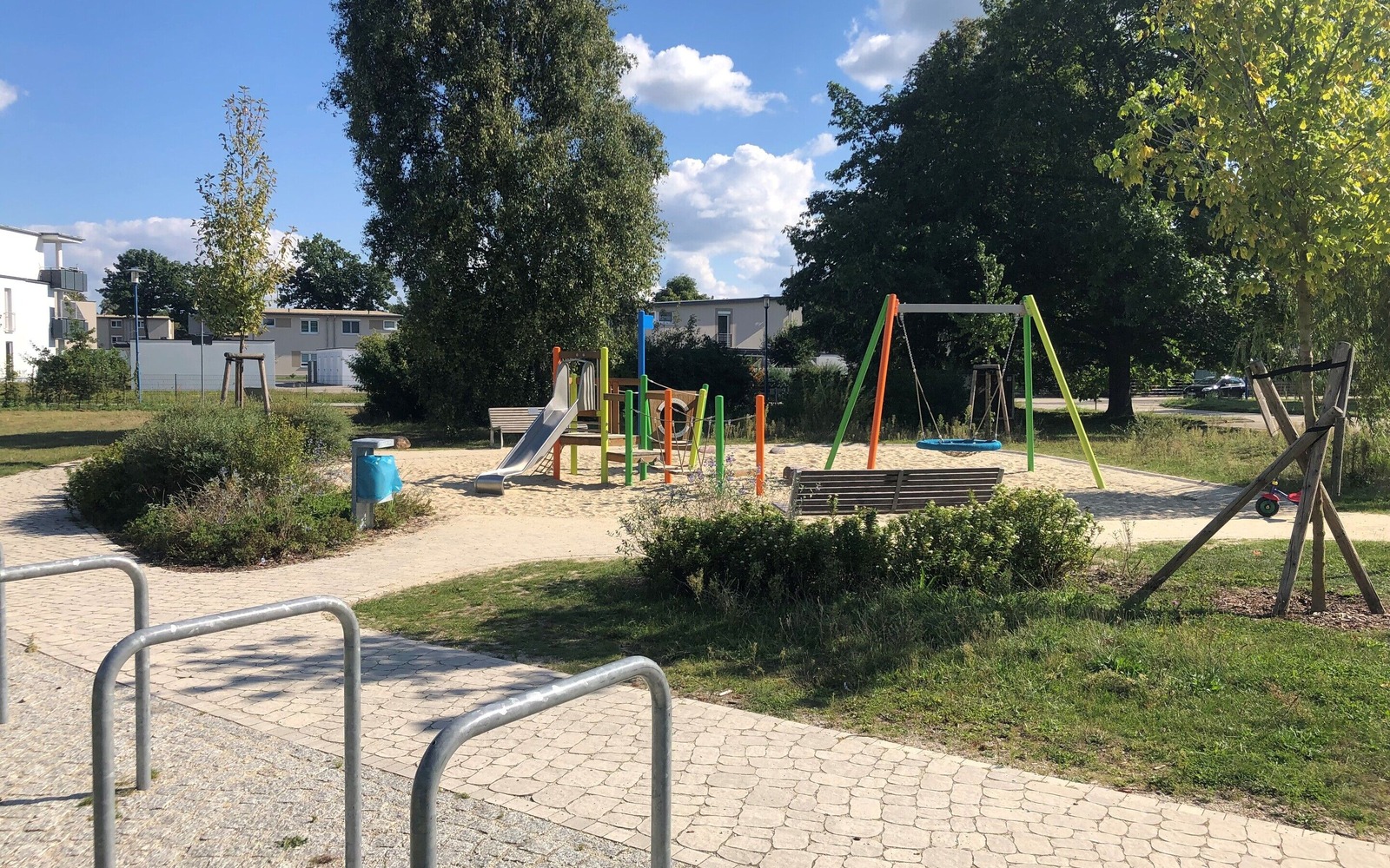 The playground is located in a well-maintained, traffic-calmed area in Hoyerswerda and consists of several age-appropriate play areas. For toddlers, there is a play area with a small climbing frame, a slide, and various balancing and climbing elements. The ground is covered with fine sand, which provides additional safety. In the immediate vicinity is a double swing with a disc-shaped net seat, suitable for several children at the same time.
