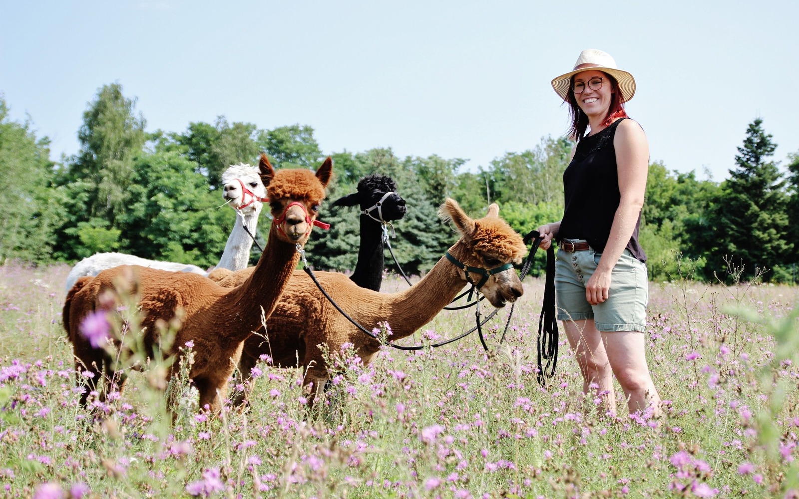 Alpacas radiate calm, security and serenity. They are curious but reserved and give people room to explore. Due to their relaxed nature, they are easy to handle and can hardly be ruffled. They approach challenges thoughtfully and in a herd. They rarely panic and keep a cool head. With these companions you will discover the Lusatian Lakeland in a whole new way.